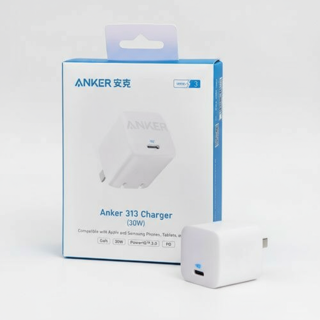 شاحن Anker 313 30W هو شاحن سريع مدمج يستخدم تقنية GaN لتوفير شحن عالي الكفاءة مع حجم صغير وأداء منخفض الحرارة. يأتي الشاحن بمنفذ USB-C يدعم تقنية Power Delivery (PD) التي توفر شحنة تصل إلى 30 واط، ما يجعله مثاليًا لشحن الهواتف الذكية، الأجهزة اللوحية، وبعض الحواسيب المحمولة بسرعة تصل إلى ثلاث مرات أسرع من الشواحن التقليدية.